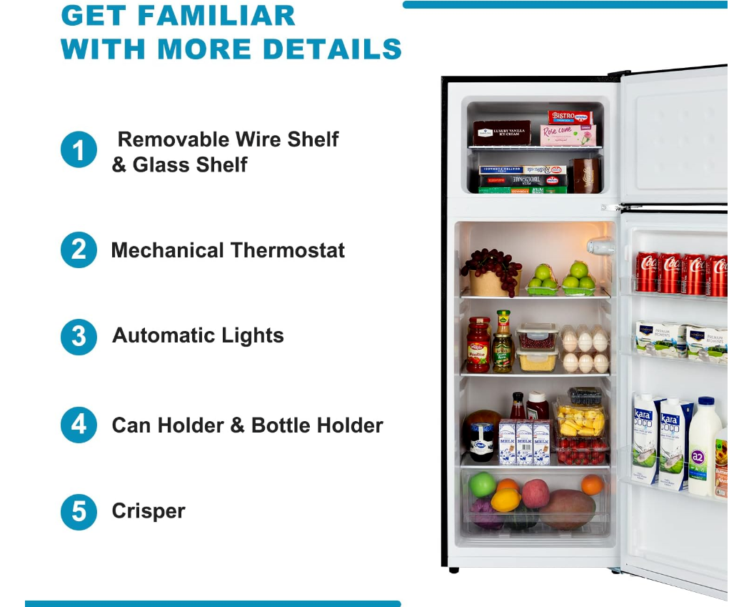 7 Adjustable Temperature Control: From 21.2°F to -0.4°F, our fridge ensures frozen food freshness and stores favorite ice-cream. Performed from 32°F to 50°F in refrigerator zone, the refrigerator keeps ingredients fresh and locking moisture.