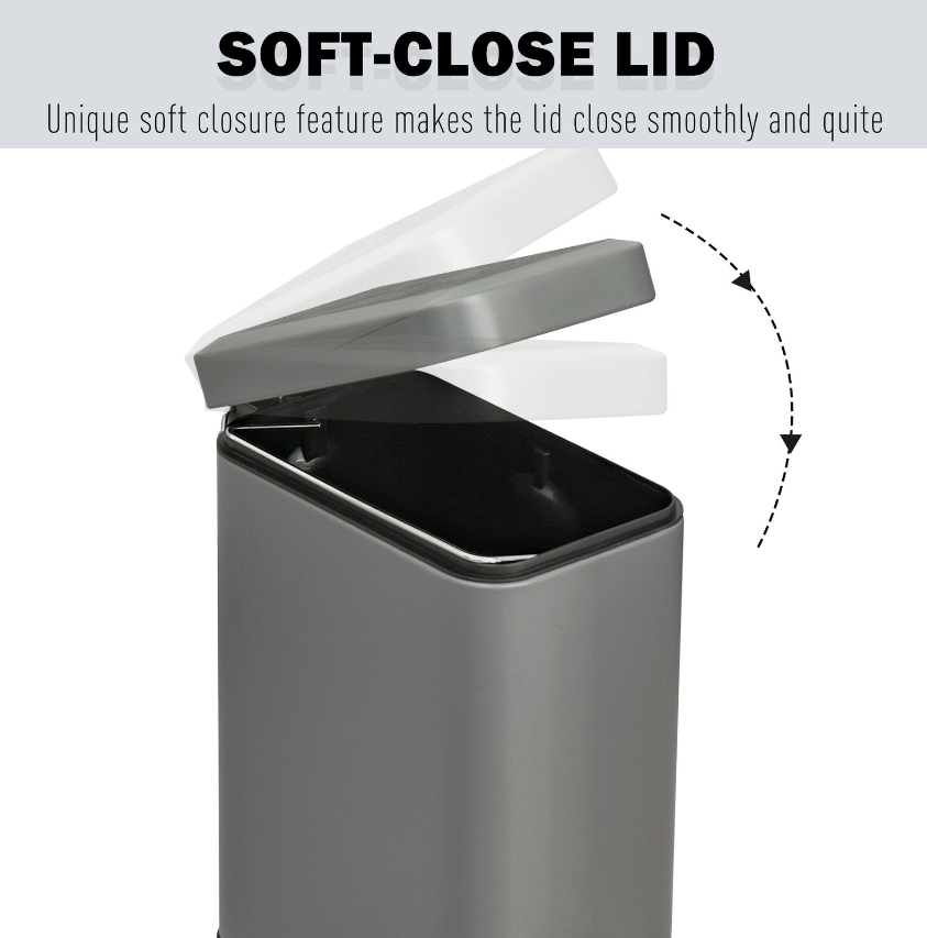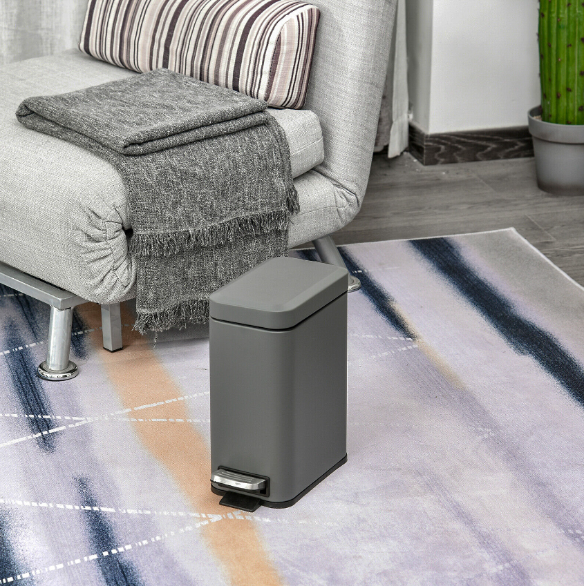 5L Rectangle Compact Bin Steel Body Inner Bucket Quiet-Close Lid w/ Pedal Grey