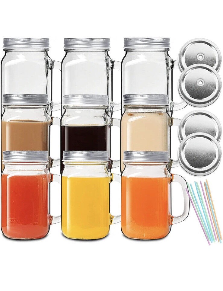 9 Pack 16 Oz Mason jar Drinking Glasses, Mason Mugs with Handle, Old Fashioned R