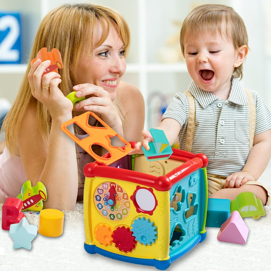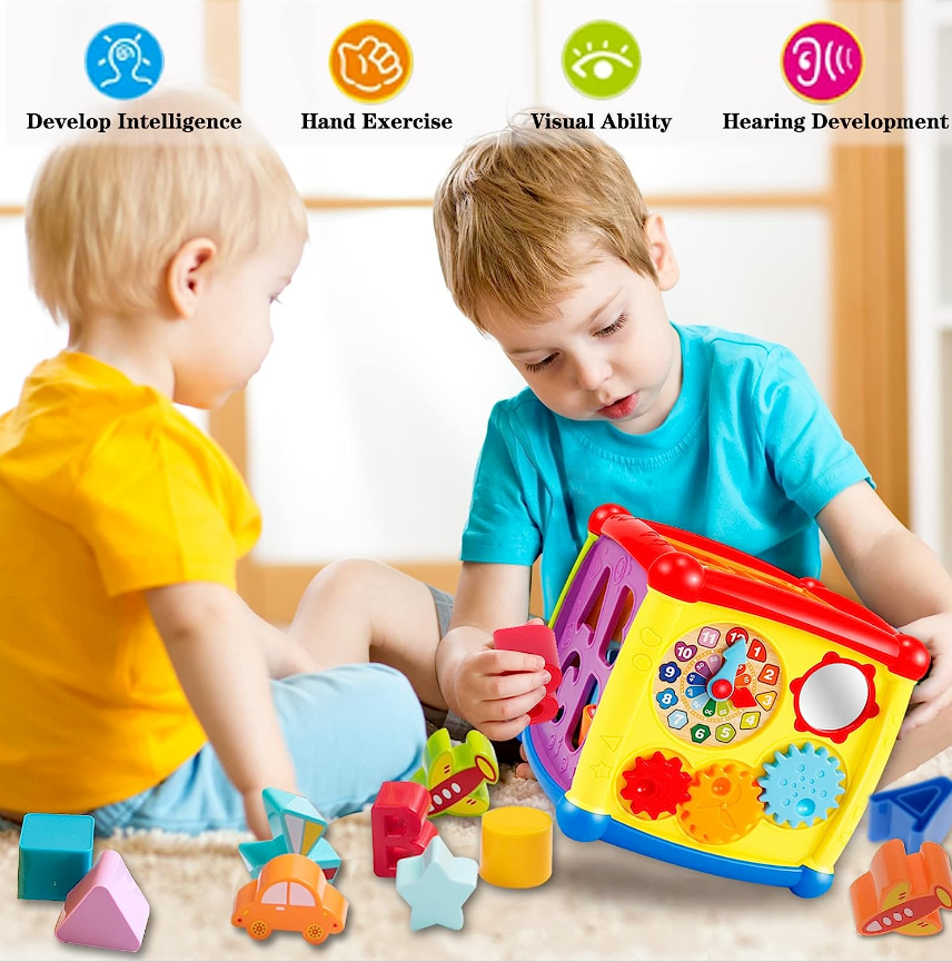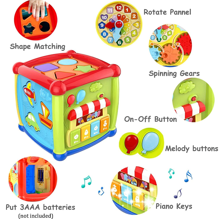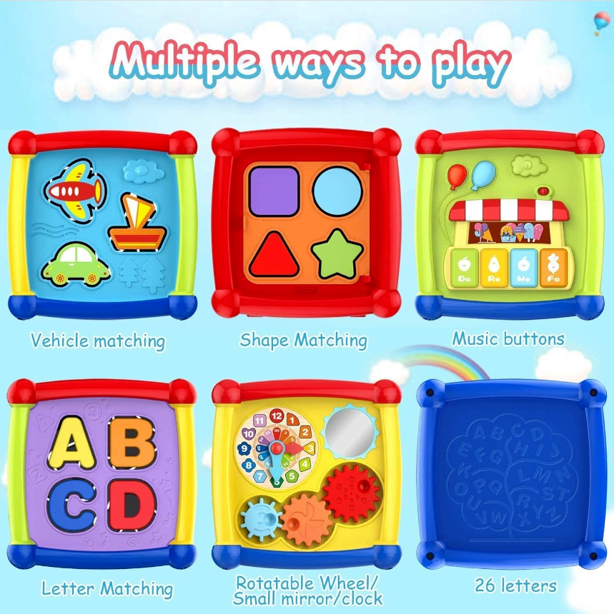 • 【6in1 Multifunction Activity Cube Toys for Kids】:This activity cube baby toys 6 to 12 month toy for 1 years old boys girls music toy includes shape sorter,rotatable gears,piano keyboard,mirror and letters.This baby toys 6 to 12 months is cute and colorful toddler toys will attract baby's attention and promoting cognition and observation.Different ways to play to develop the child's intelligence, so that children think, hands to explore the fun.Idea gifts for 1 year old boys girls