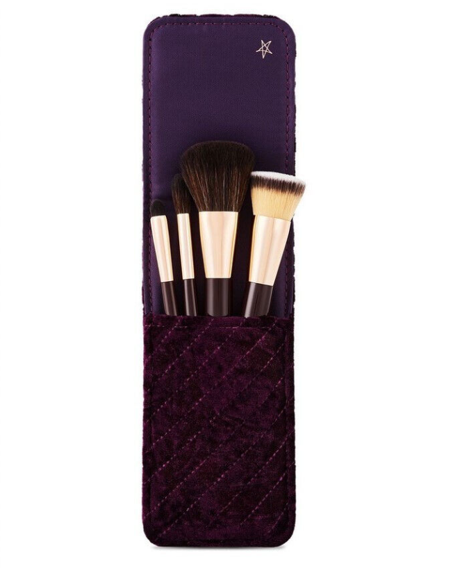 Beautify your complexation and eyes with this Charlotte Tilbury mini brush set. encased in a chic velvet clutch,  this makeup brush set is great for effortless desk to disco transformation!