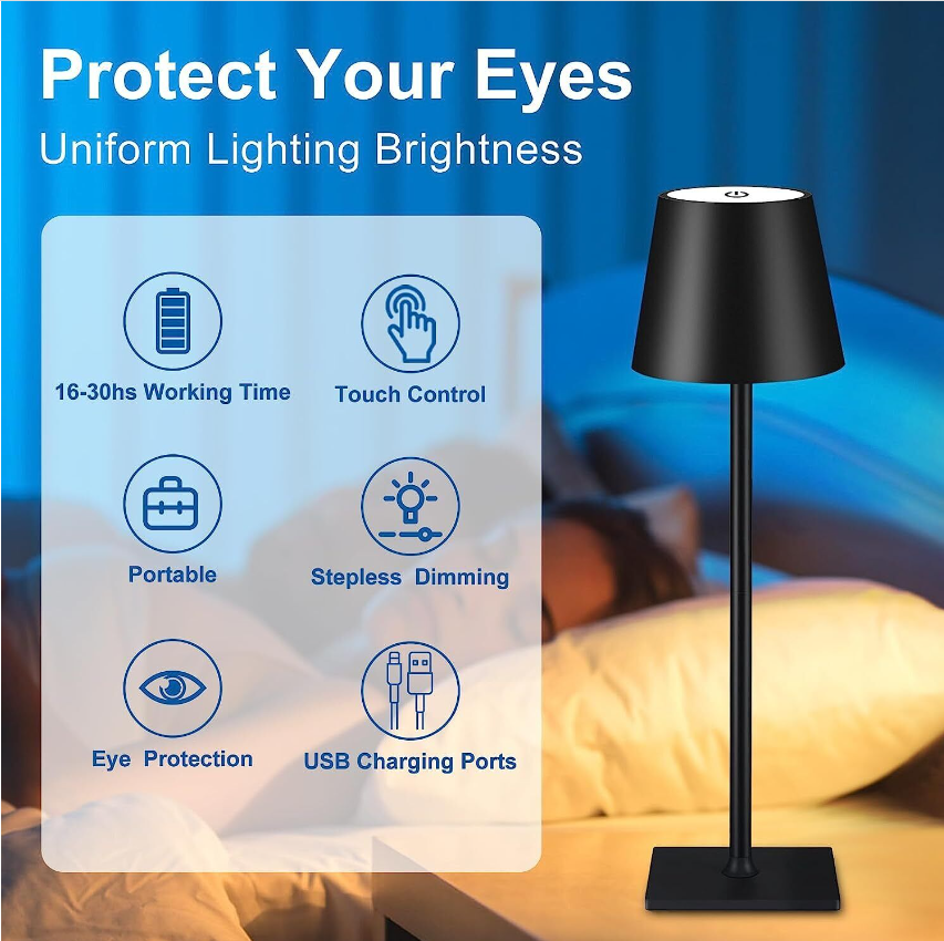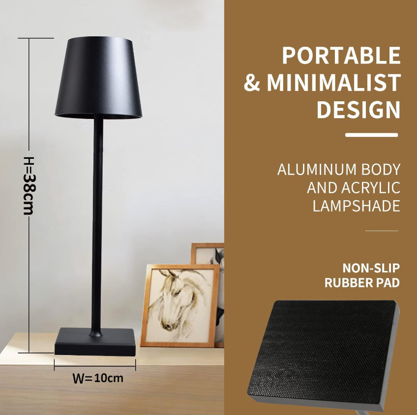 【MINIMALIST DESIGN】:Our portable rechargeable table lamp with unique and elegant round design, smooth and slender metal arm and matte light shadow make it look fashionable and minimalist, which can be matched with various scenes and styles. Suitable for bedroom, nightstand, office, restaurant, cafe, bar, hotel, outdoor patio lighting and so on. It is also a thoughtful gift for the holiday season.
