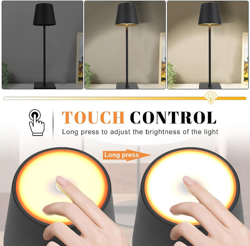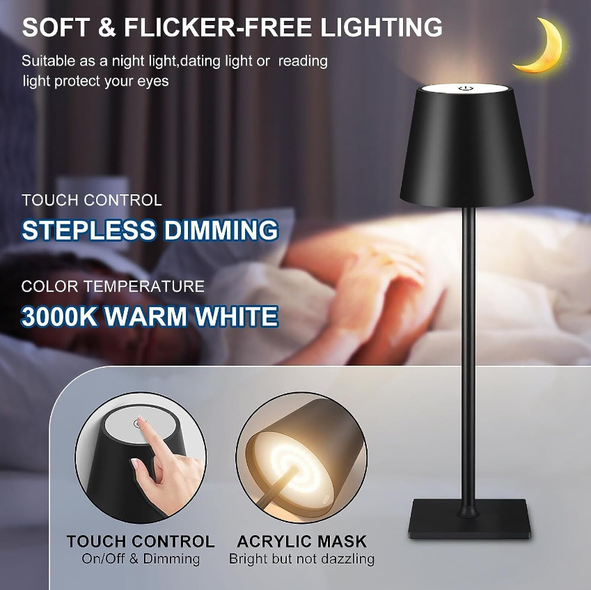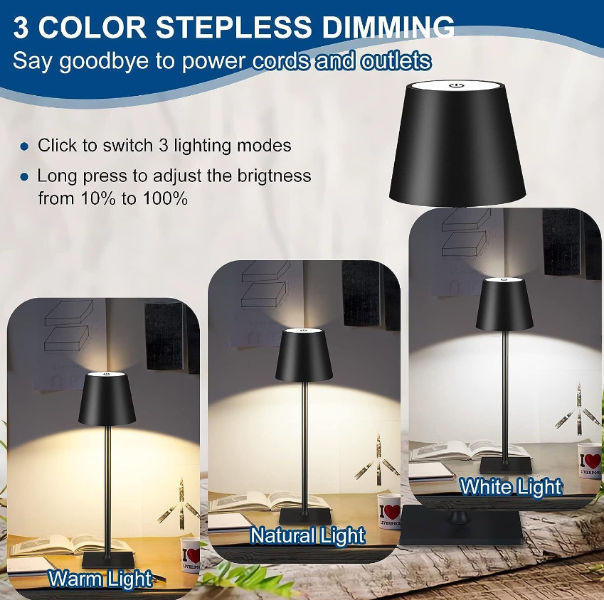 【3 COLORS & STEPLESS DIMMING】:Our cordless desk lamp has 3 color temperatures to choose from: white, warm and warm white. Control it by touching the switch, click to switch the light mode, long press to control the light brightness (10%-100%). And with memory function, when you turn on our table lamp again, it will automatically restore the last adjusted brightness.