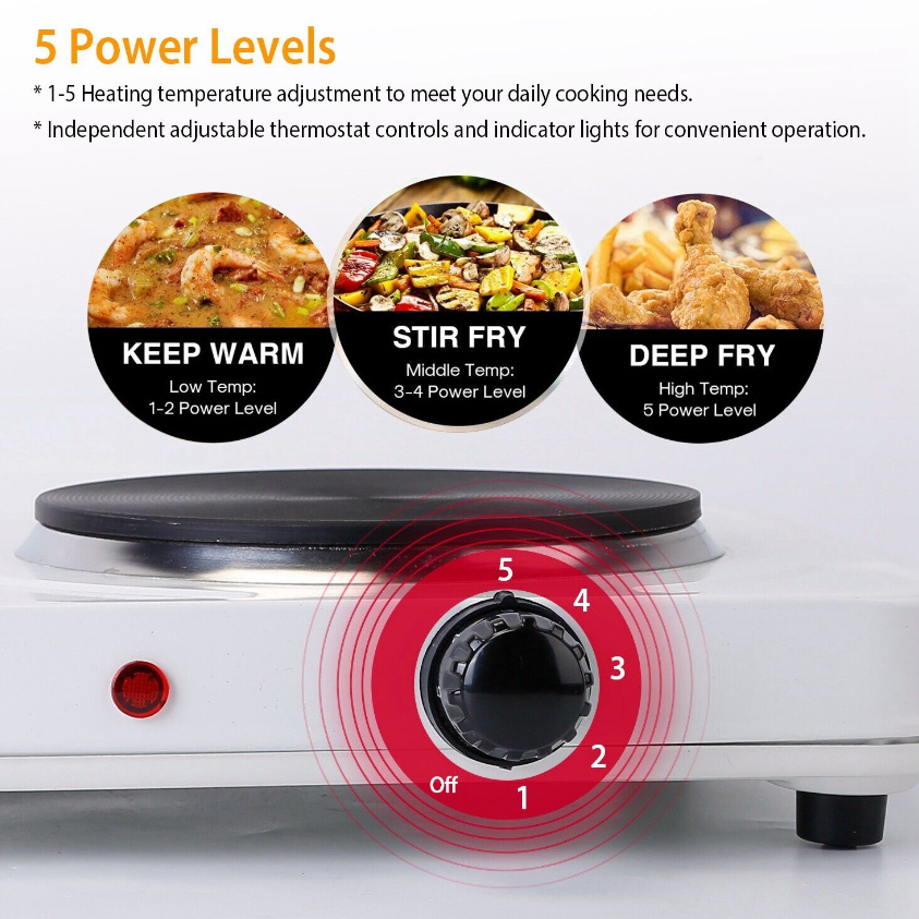 • 5 Power Levels:With 1-5 heating temperature adjustment,easily meet your daily cooking needs,such as boiling water,reheating sauces,making soups,frying steak,cooking pasta,grilling cheese and vegetables,etc.. Independent adjustable thermostat controls and indicator lights for convenient operation.