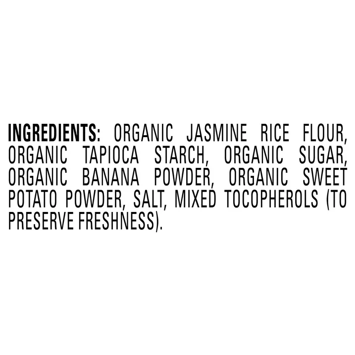 ORGANIC JASMINE RICE FLOUR, ORGANIC TAPIOCA STARCH, ORGANIC SUGAR, ORGANIC BANANA POWDER, ORGANIC SWEET POTATO POWDER, SALT, MIXED TOCOPHEROLS (TO PRESERVE FRESHNESS).