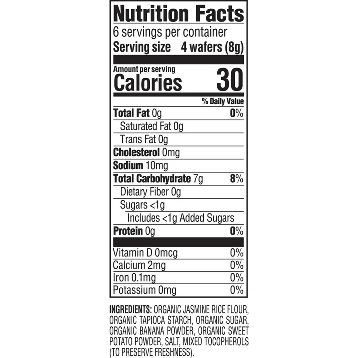 • Ingredients Inclue: Organic Jasmine Rice Flour, Organic Tapioca Starch, Organic Sugar, Organic Banana Powder, Organic Sweet Potato Powder (see nutrition facts panel for full ingredients list)