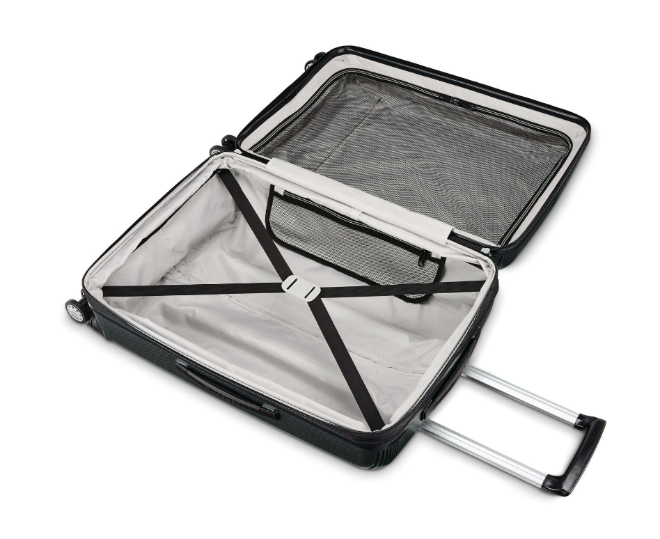 • The carry-on friendly bag is larger sized for extra packing capacity. Inside: Elastic tie-down straps, side mesh pocket for small items, zipped mesh divider for neat organization.