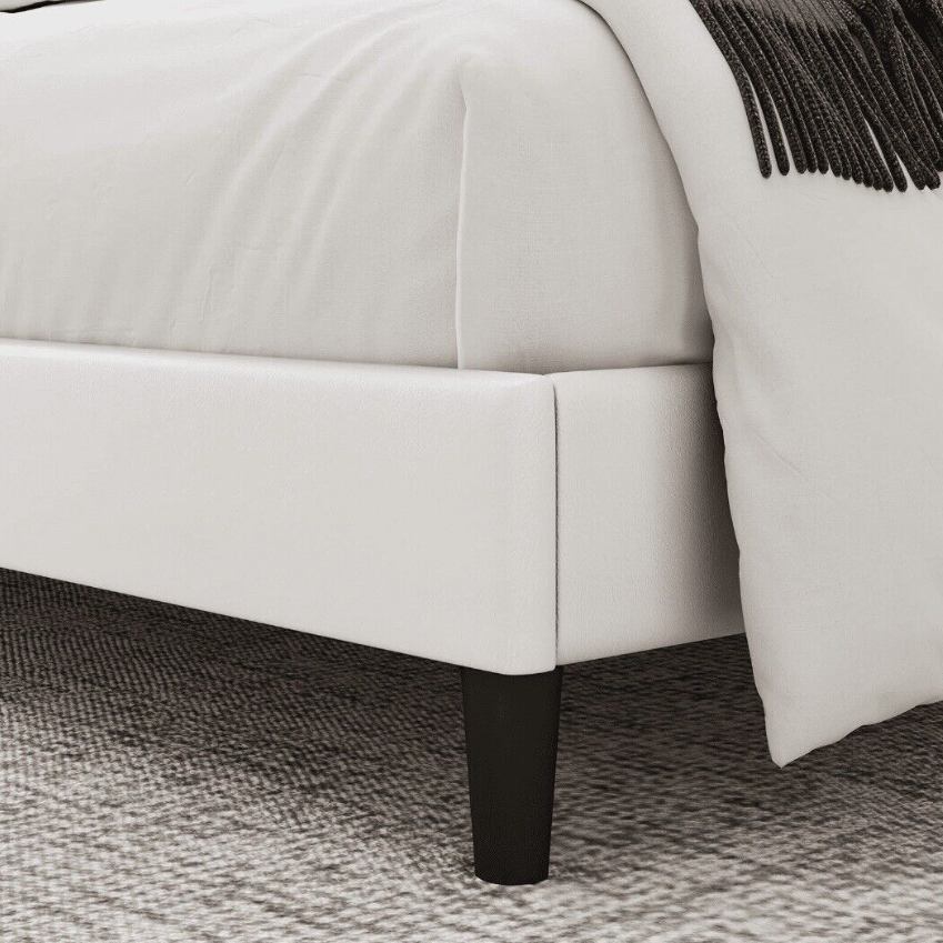 White Faux Leather Upholstered Button Tufted Low Profile Platformed Bed Frame.